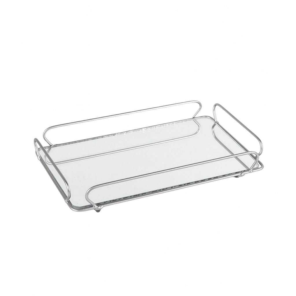 Bandeja retangular com estrutura metálica (pintura eletrostática) e base espelhada. Ideal para decorar lavabos, penteadeiras, aparadores ou mesas. Perfeita para organizar perfumes, velas, joias e pequenos objetos com elegância.