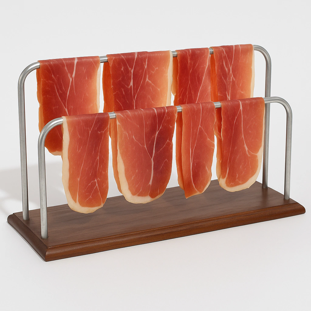 Destaque seus frios de forma sofisticada com o suporte. Perfeito para buffets, restaurantes e eventos, essa peça conta com uma estrutura de alumínio para pendurar fatias de presunto, salames e embutidos, garantindo uma apresentação elegante e prática. Sua base de madeira resistente adiciona um toque rústico e refinado, tornando-o ideal para compor tábuas de frios e aperitivos de maneira criativa e profissional.