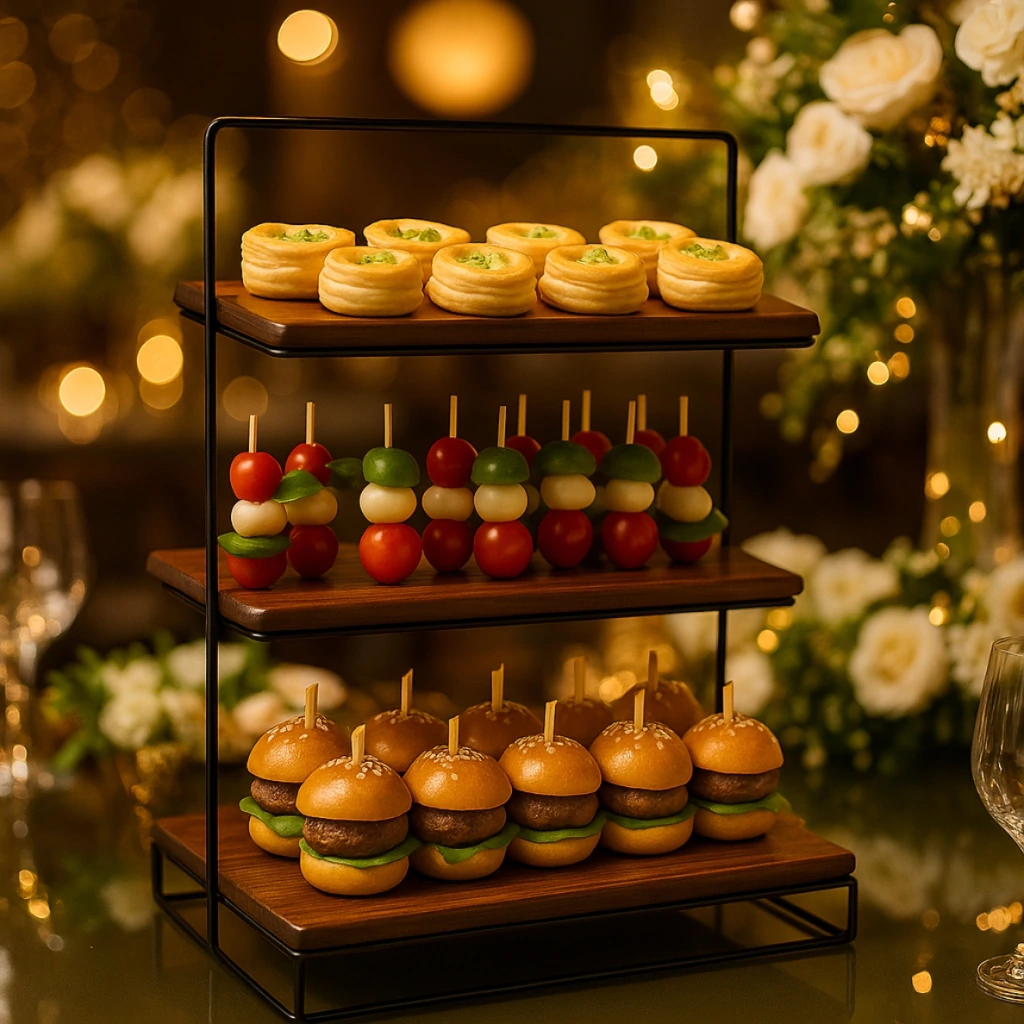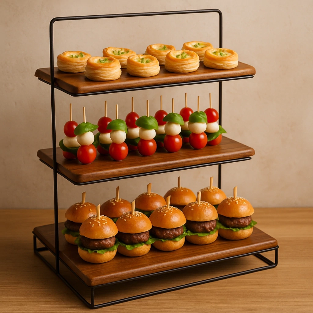 Sofisticação e funcionalidade em um único produto. Este expositor triplo combina madeira de acabamento rústico com uma estrutura metálica minimalista, criando um visual moderno e versátil para buffets, eventos, cafeterias e decoração de interiores. Com três níveis de apoio, é ideal para organizar e destacar petiscos, doces, produtos decorativos ou utilitários de forma elegante.