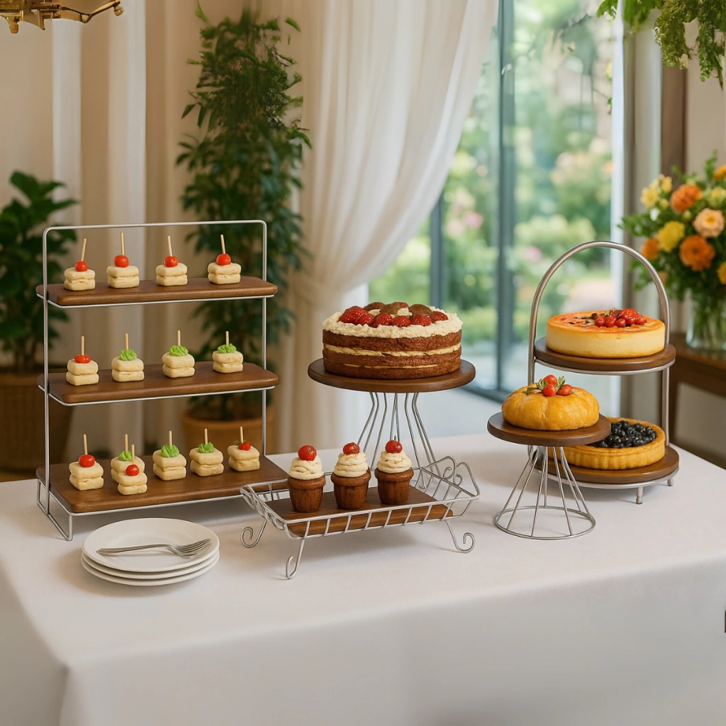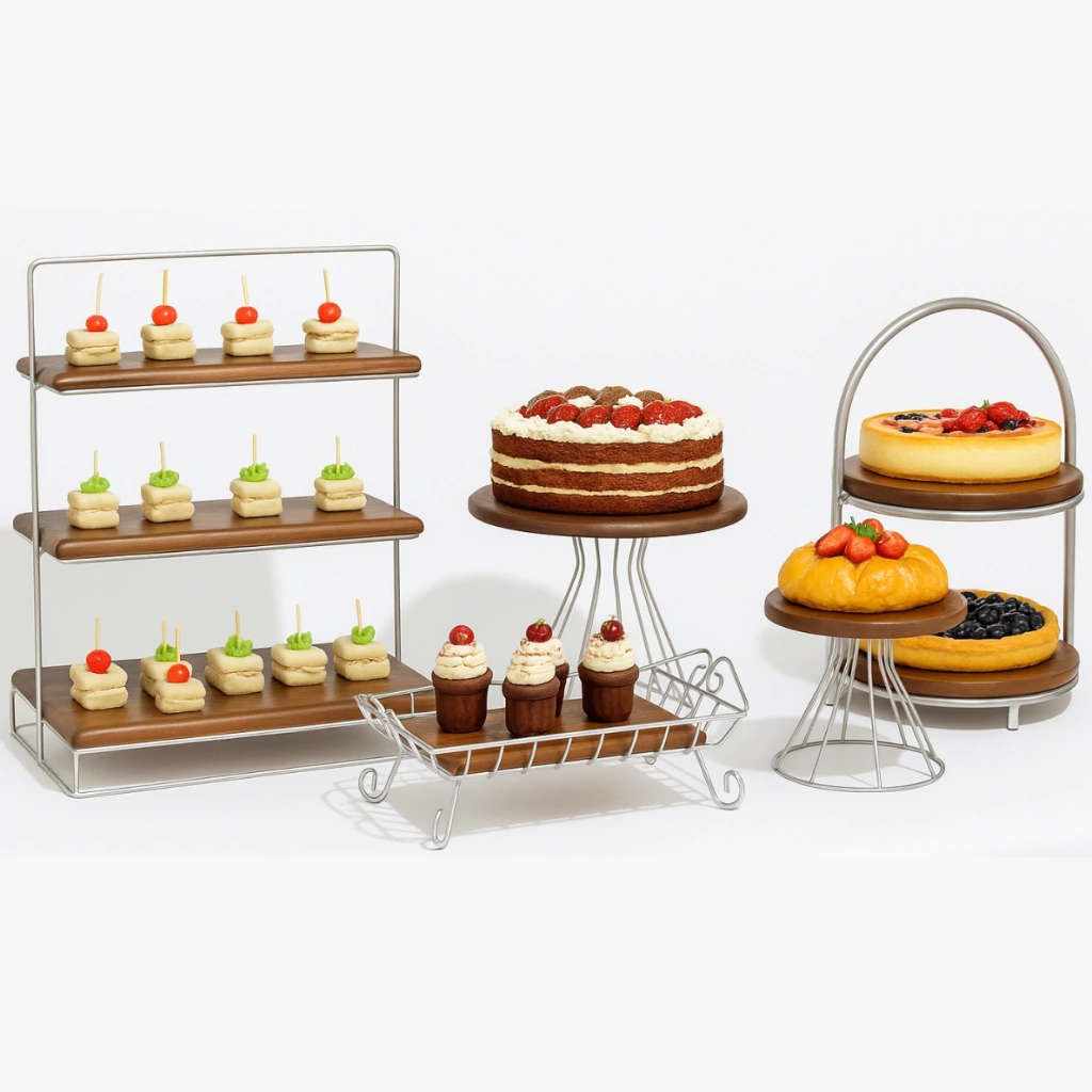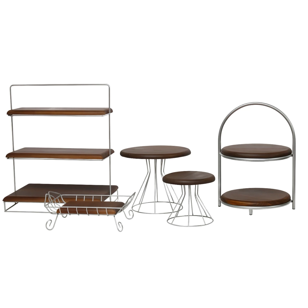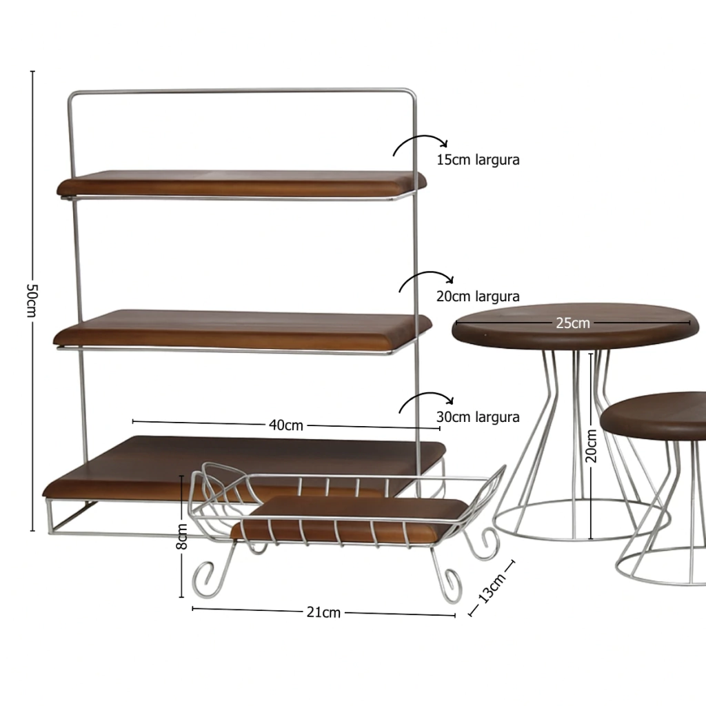 Este kit completo é ideal para compor mesas de festa, buffets e eventos com muito charme e praticidade. Composto por suportes de metal com bases em madeira, ele acomoda uma grande variedade de doces, bolos e finger foods com elegância. O design moderno aliado ao acabamento rústico cria uma composição sofisticada para valorizar ainda mais a apresentação dos alimentos.