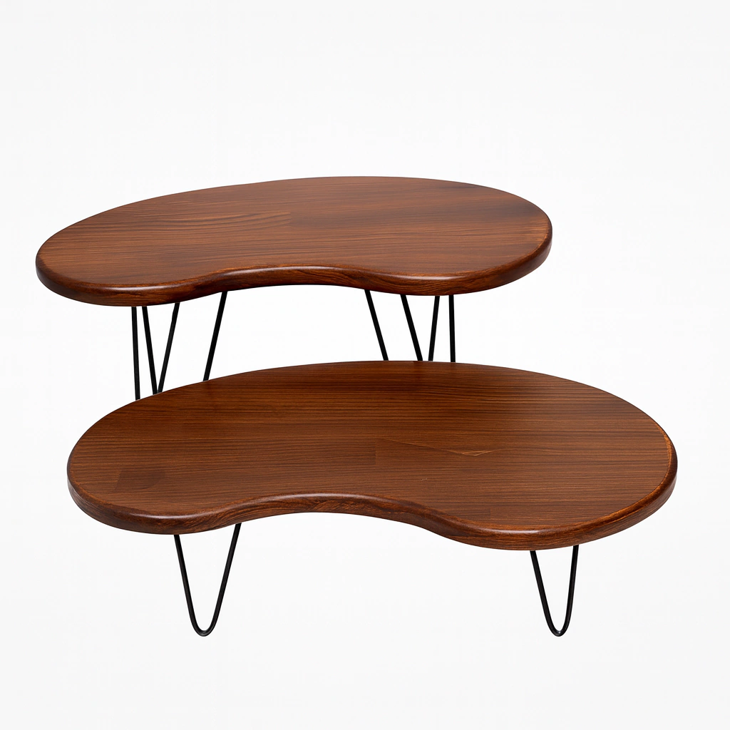 Produzido em madeira de alta qualidade, o suporte possui design orgânico com curvas suaves e pés metálicos no estilo hairpin, garantindo estabilidade e um visual moderno que combina com eventos sociais, casamentos, coffee breaks e mesas gastronômicas profissionais.