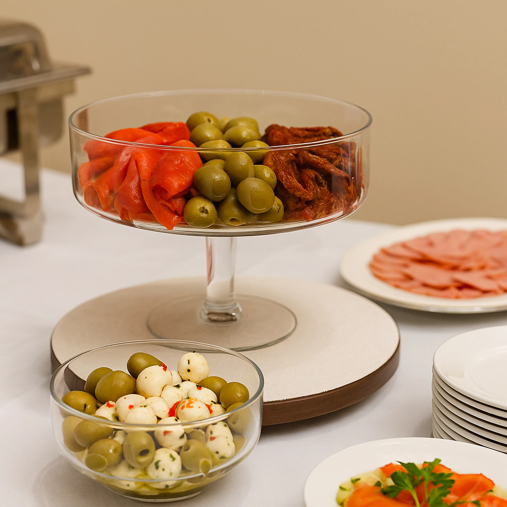 A Peça de Vidro com Pé Baixo é elegante e versátil, perfeita para servir com charme em diferentes ocasiões. Seu design transparente e moderno valoriza os alimentos apresentados, trazendo sofisticação para mesas de eventos, buffets e recepções.