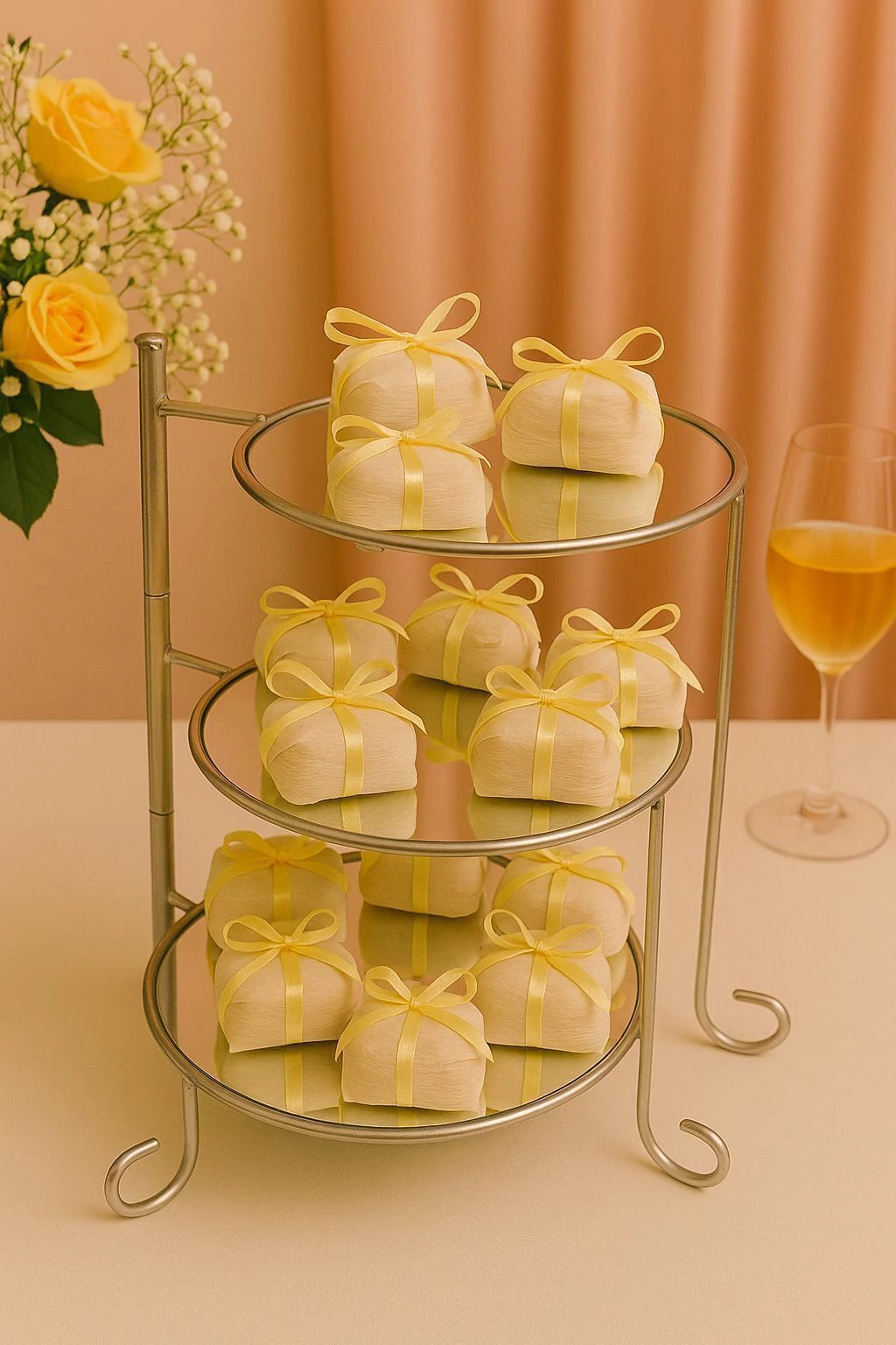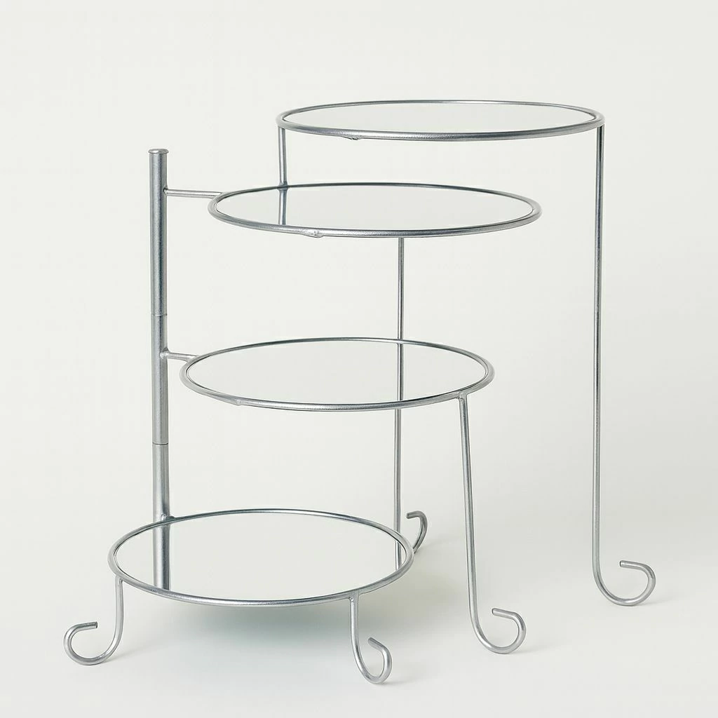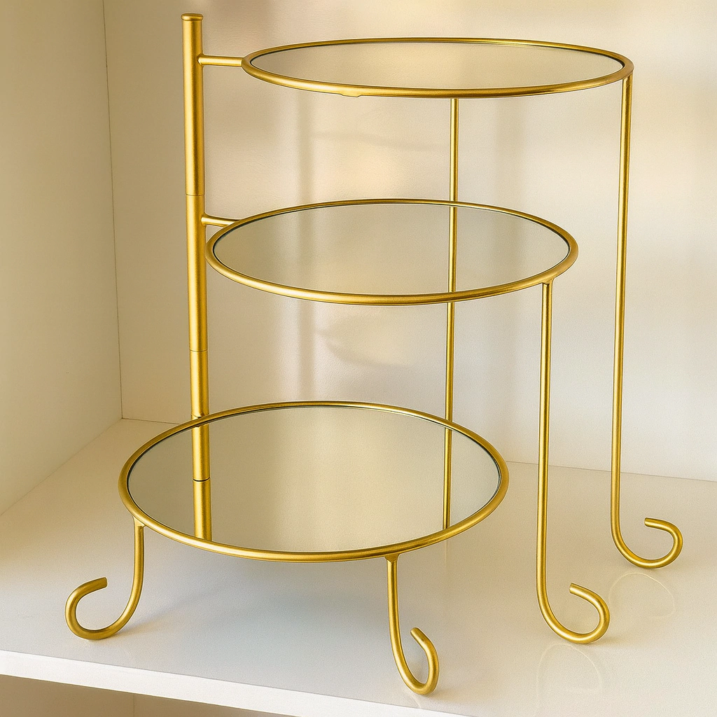 Com estrutura metálica resistente em acabamento prata e bandejas com base espelhada, ele garante requinte e modernidade na composição. Seu design articulado permite diferentes aberturas e posicionamentos, proporcionando praticidade na montagem e destaque para cada andar.