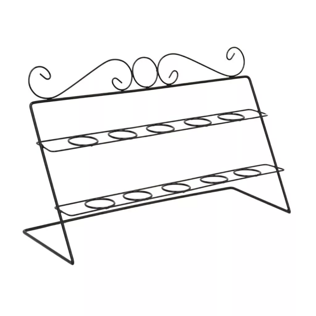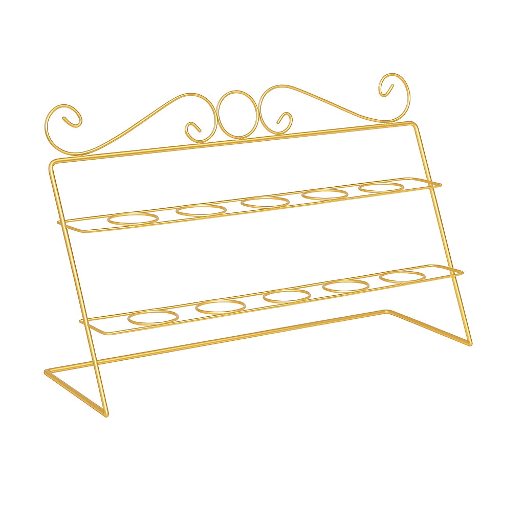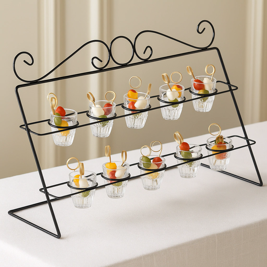Realce a apresentação do seu buffet com este suporte elegante em metal preto brilhante, pensado para organizar e valorizar finger foods em copinhos de vidro. O design com duas prateleiras inclinadas e arabescos decorativos confere um toque sofisticado, enquanto otimiza o espaço da mesa e facilita o serviço. Perfeito para coquetéis, recepções, cafeterias, hotéis e eventos corporativos, o expositor garante visibilidade atraente dos petiscos, tornando‐os ainda mais irresistíveis aos convidados.