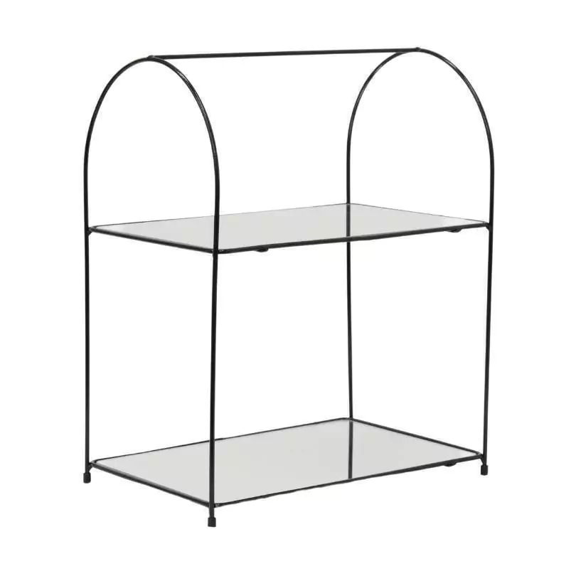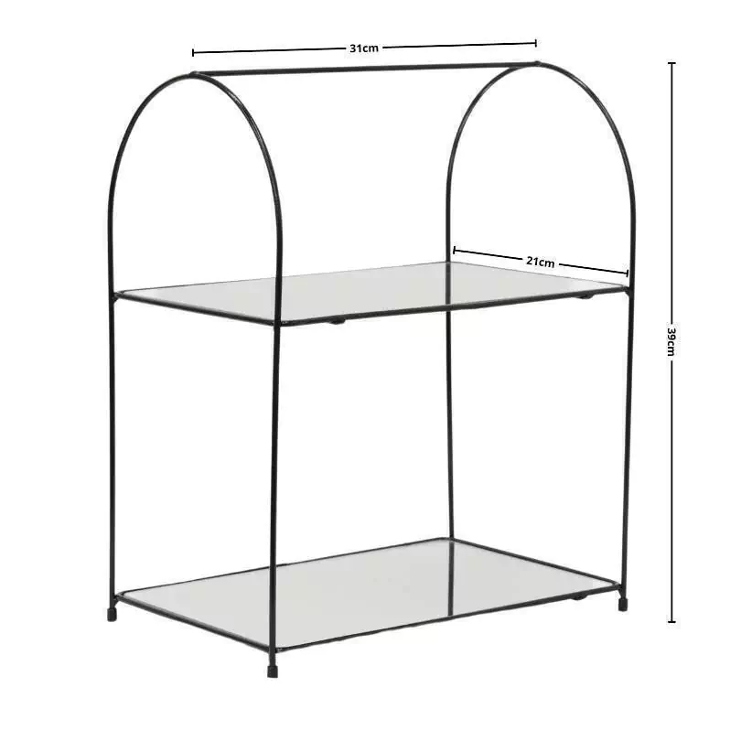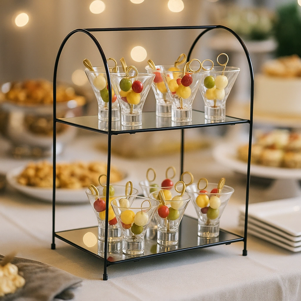 Eleve a apresentação dos seus finger foods, doces finos e mini sobremesas com este suporte de dois níveis em metal preto brilhante. O design em arco confere leveza visual, enquanto as prateleiras espelhadas refletem a luz e valorizam cada detalhe dos itens servidos — perfeito para buffets, recepções de hotéis, coffee breaks corporativos e eventos sociais.