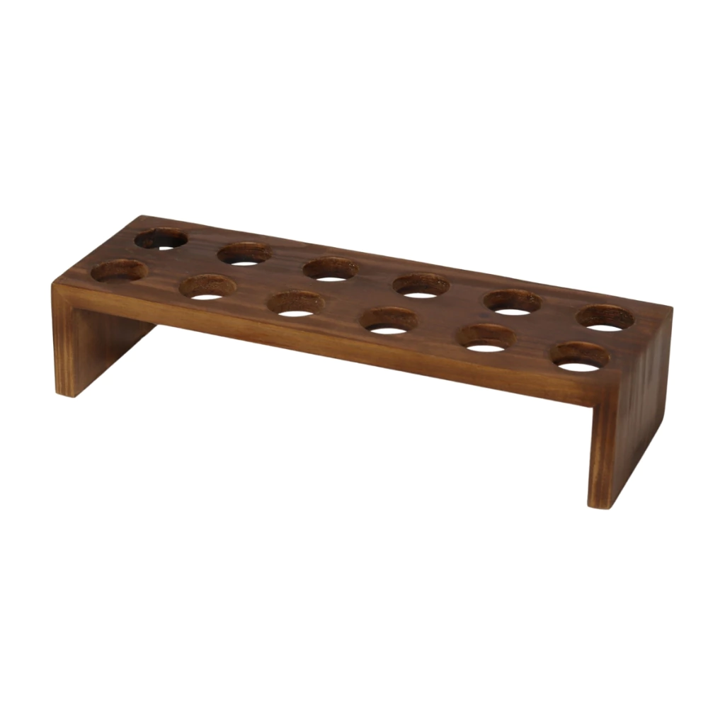 Sofisticação e funcionalidade para compor mesas de buffet, festas e eventos. Este suporte de madeira com 12 cavidades é perfeito para apresentar degustações de forma organizada e elegante. Seu design rústico e acabamento de qualidade agregam charme à apresentação, sendo uma excelente opção para servir petiscos, caldinhos, doces ou bebidas em copinhos.