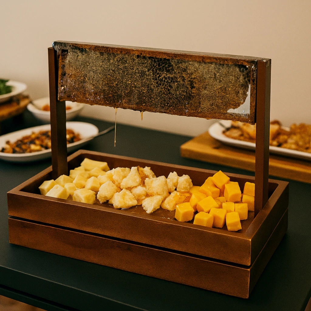 A base retangular é levemente rebaixada para acomodar o mel que escorre do favo, evitando sujeira e facilitando a organização do ambiente. As laterais elevadas sustentam o favo com segurança, permitindo que os convidados se sirvam diretamente com colherzinhas ou espátulas.