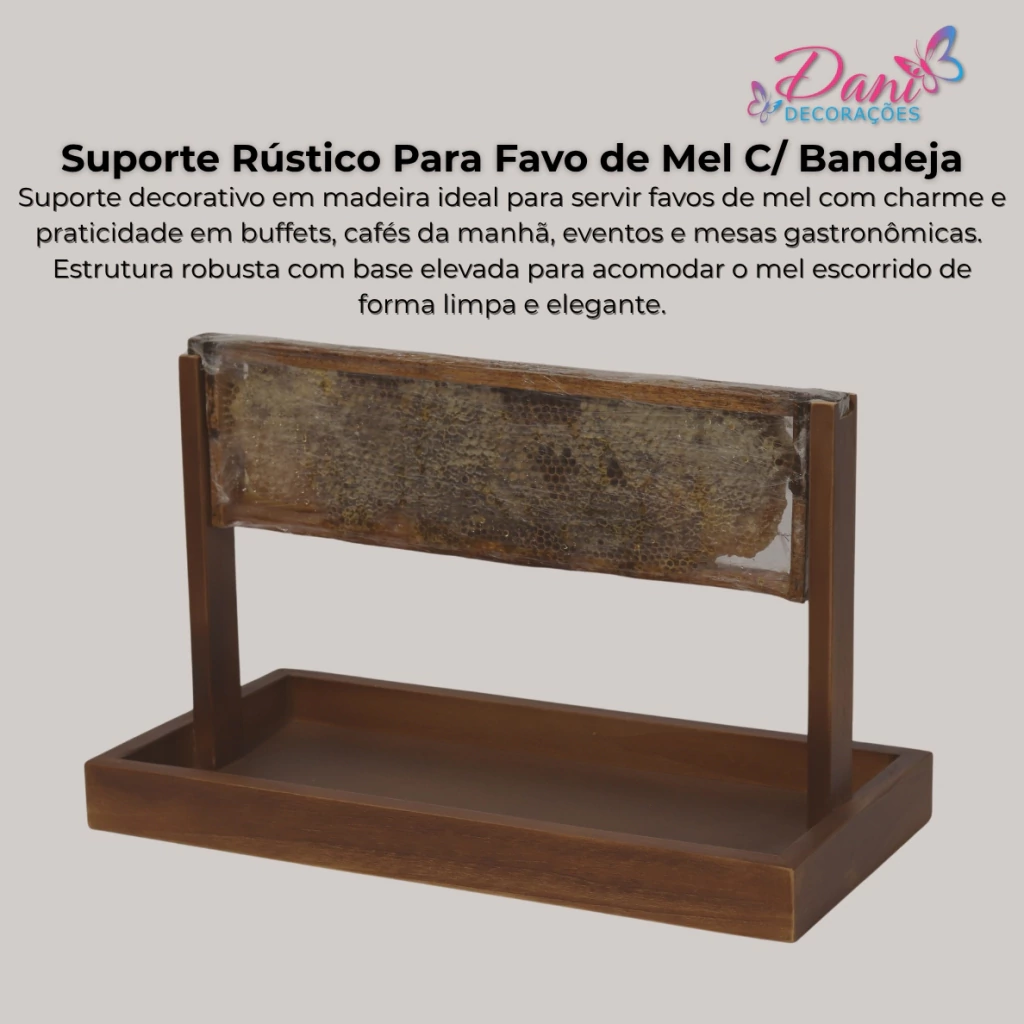 O suporte de madeira para favo de mel é a escolha perfeita para quem deseja apresentar o mel de forma elegante e diferenciada em eventos, cafés da manhã, brunches, buffets ou mesas de café colonial. Fabricado em madeira de alta qualidade, possui estrutura firme com acabamento rústico e ao mesmo tempo sofisticado, que valoriza o visual da mesa.