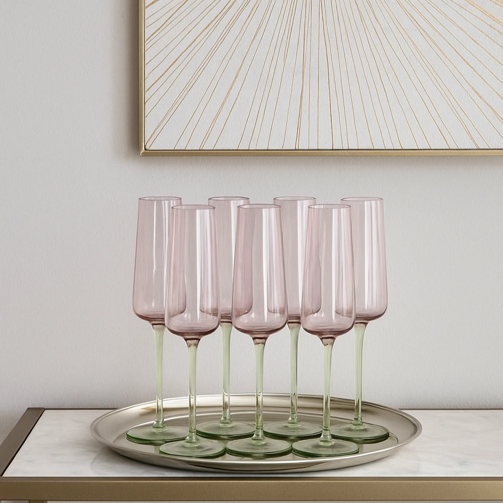 Encante seus convidados com o charme e a delicadeza deste jogo com 6 taças de vidro rosa e verde, perfeitas para quem ama unir elegância e estilo à mesa.