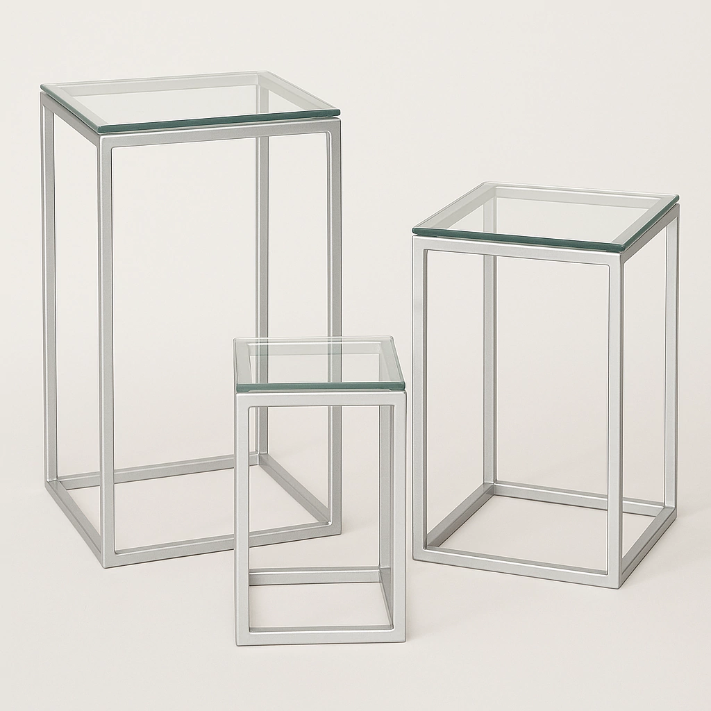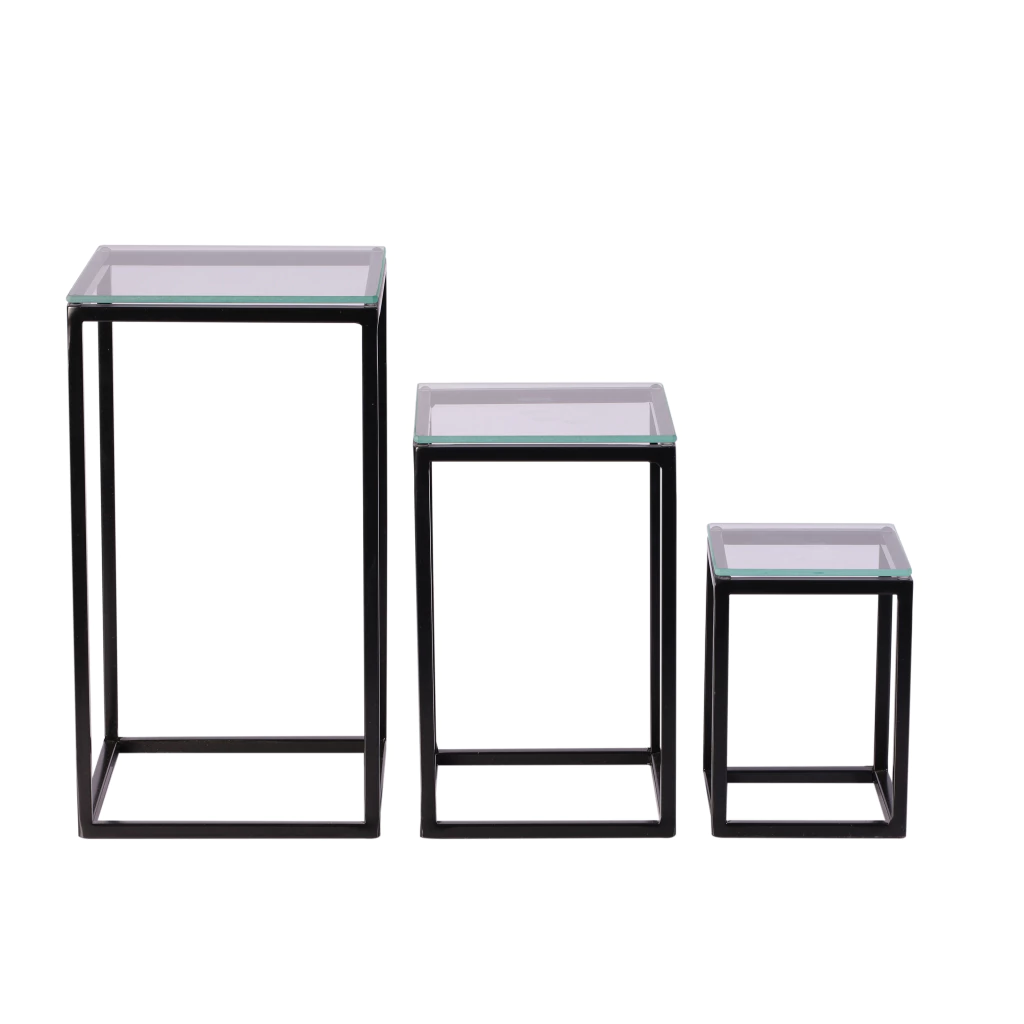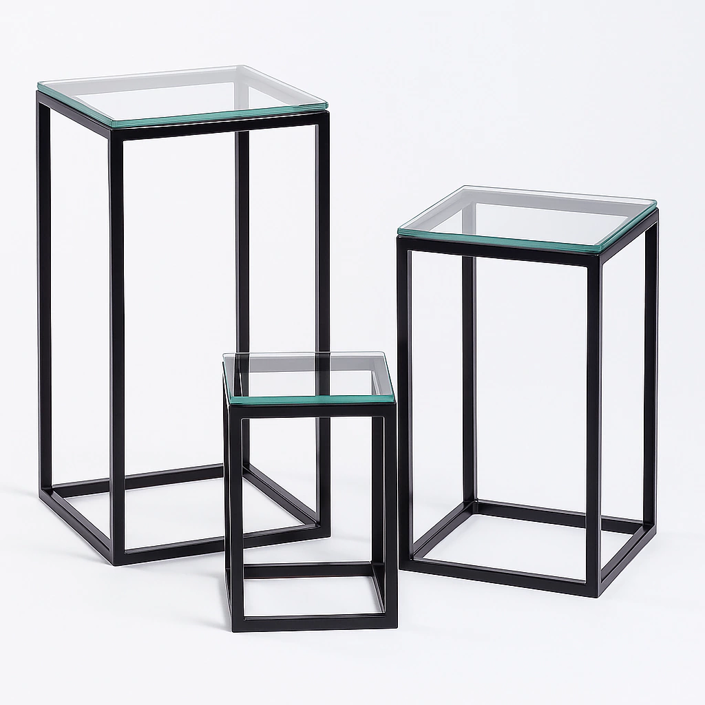 Conjunto de suportes com design moderno e minimalista, ideal para valorizar a apresentação de produtos, arranjos florais ou elementos decorativos em buffets, eventos e ambientes sofisticados. Estrutura metálica resistente com pintura eletrostática preta brilhante e tampo de vidro temperado, garantindo elegância e durabilidade.