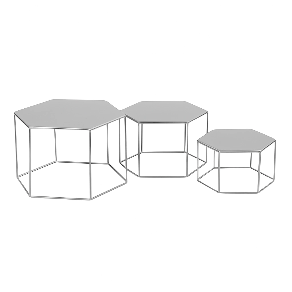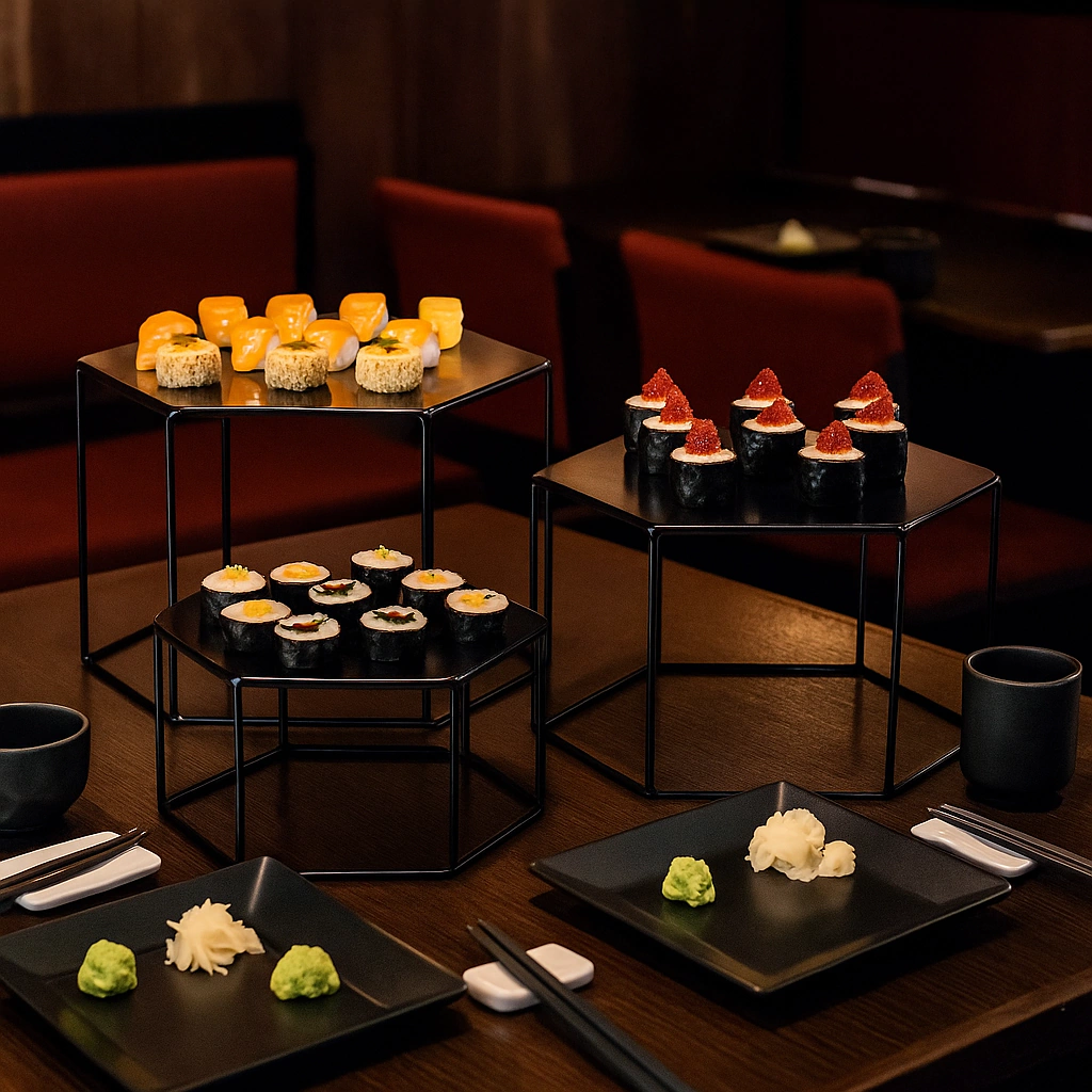 Transforme a apresentação do seu buffet ou espaço comercial com este elegante conjunto de mesas hexagonais. Com estrutura metálica resistente e acabamento em pintura eletrostática, elas unem design moderno e funcionalidade.